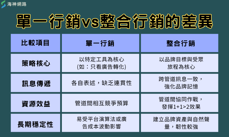 相對而言,整合行銷則是在建構一個「面」。下表列出了兩者的核心差異: