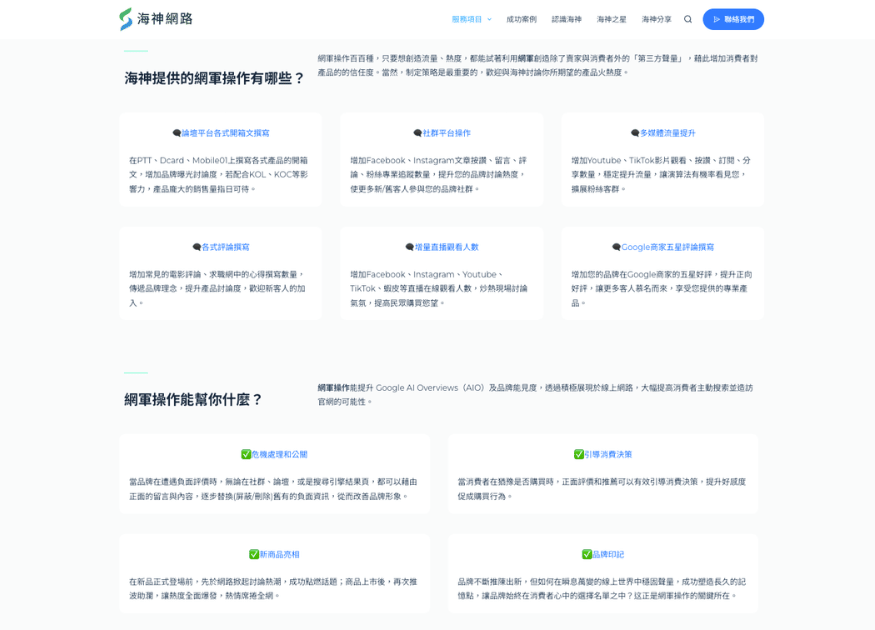 面對數位時代的口碑挑戰,您不需要孤軍奮戰。海神網路行銷 專精於全方位的「口碑戰略」與「品牌風險管理」,將核心 SEO 技術與網軍操作深度結合,透過精準的數據分析,將零散的市場評論轉化為您的品牌數位資產。
